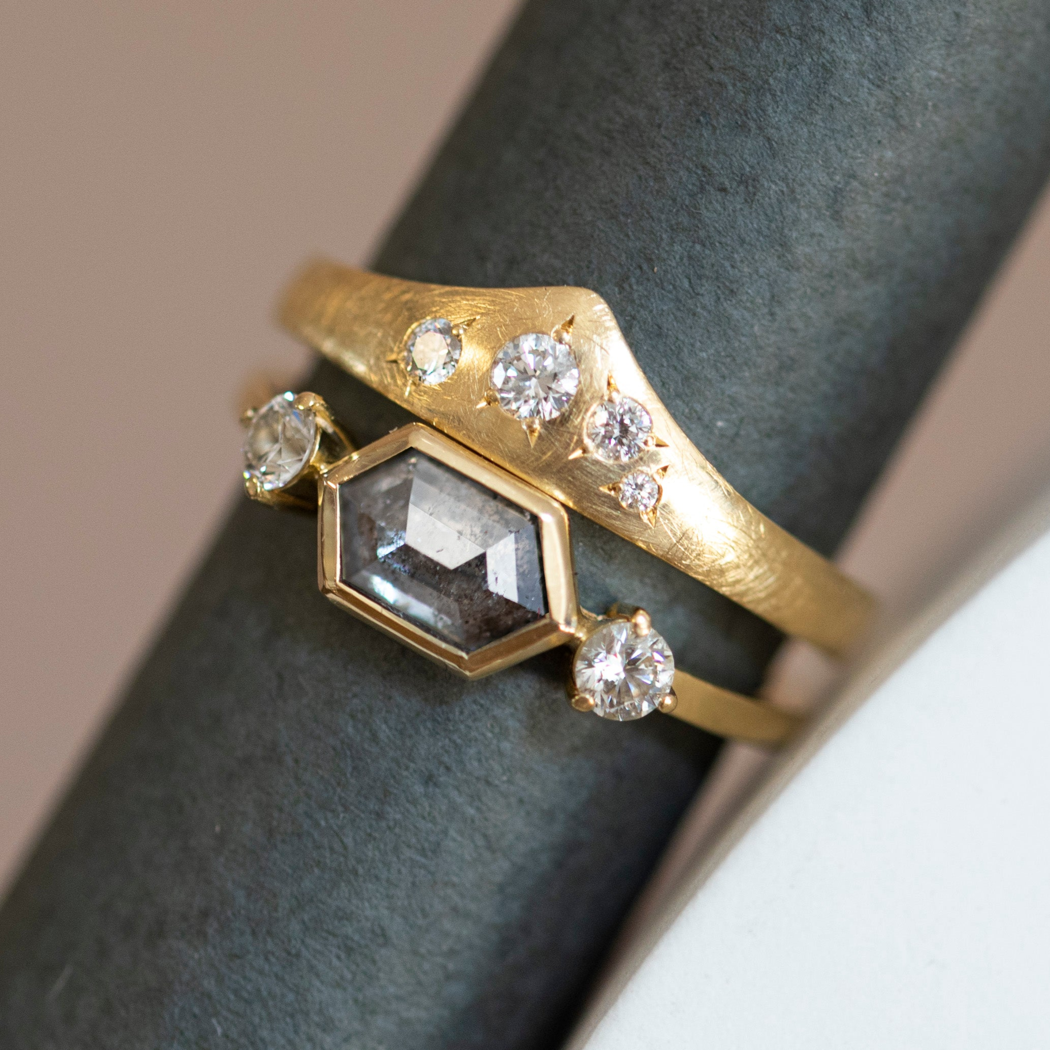 Bespoke engagement ring re-usung clients small heirloom white diamonds paired with a newly sourced hexagon S&P diamond.